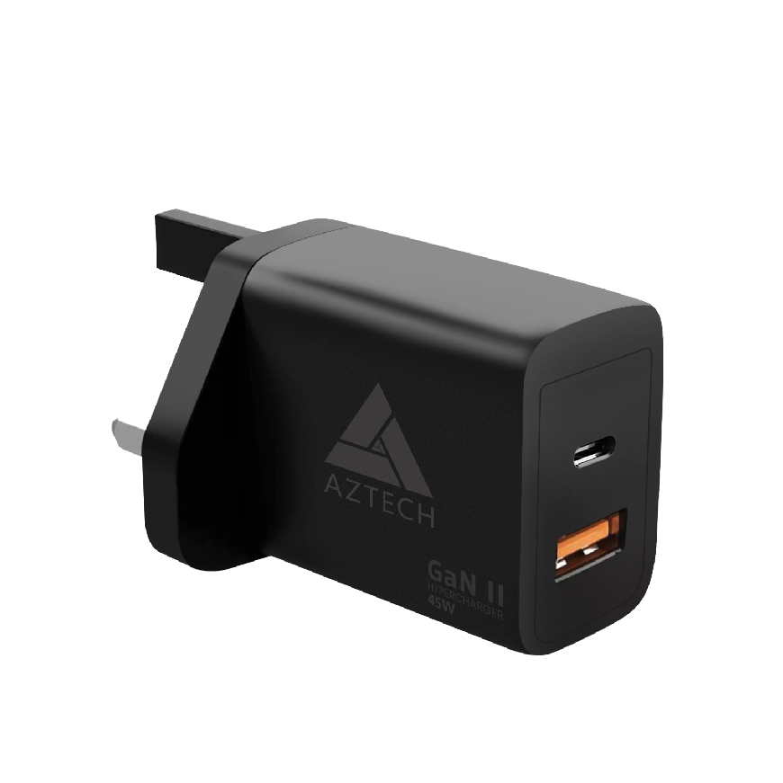 The AZTECH GaN II Hypercharger Adapter 45W is an ultra-compact and efficient charging solution designed for fast and reliable power delivery to multiple devices. Featuring advanced GaN (Gallium Nitride) technology, this adapter provides high-power charging experience while maintaining less energy consumption. This adapter featuresdual port, one USB-C and one USB-A, offering flexible charging options for a wide range of devices, from smartphones and tablets to laptops and more. And the adapter is equipped with Qualcomm Quick Charge 3.0 support for rapid charging speeds, ensuring your devices are powered up quickly and safely. Its built-in safety features, including over-current and over-voltage protection, offer peace of mind while charging.