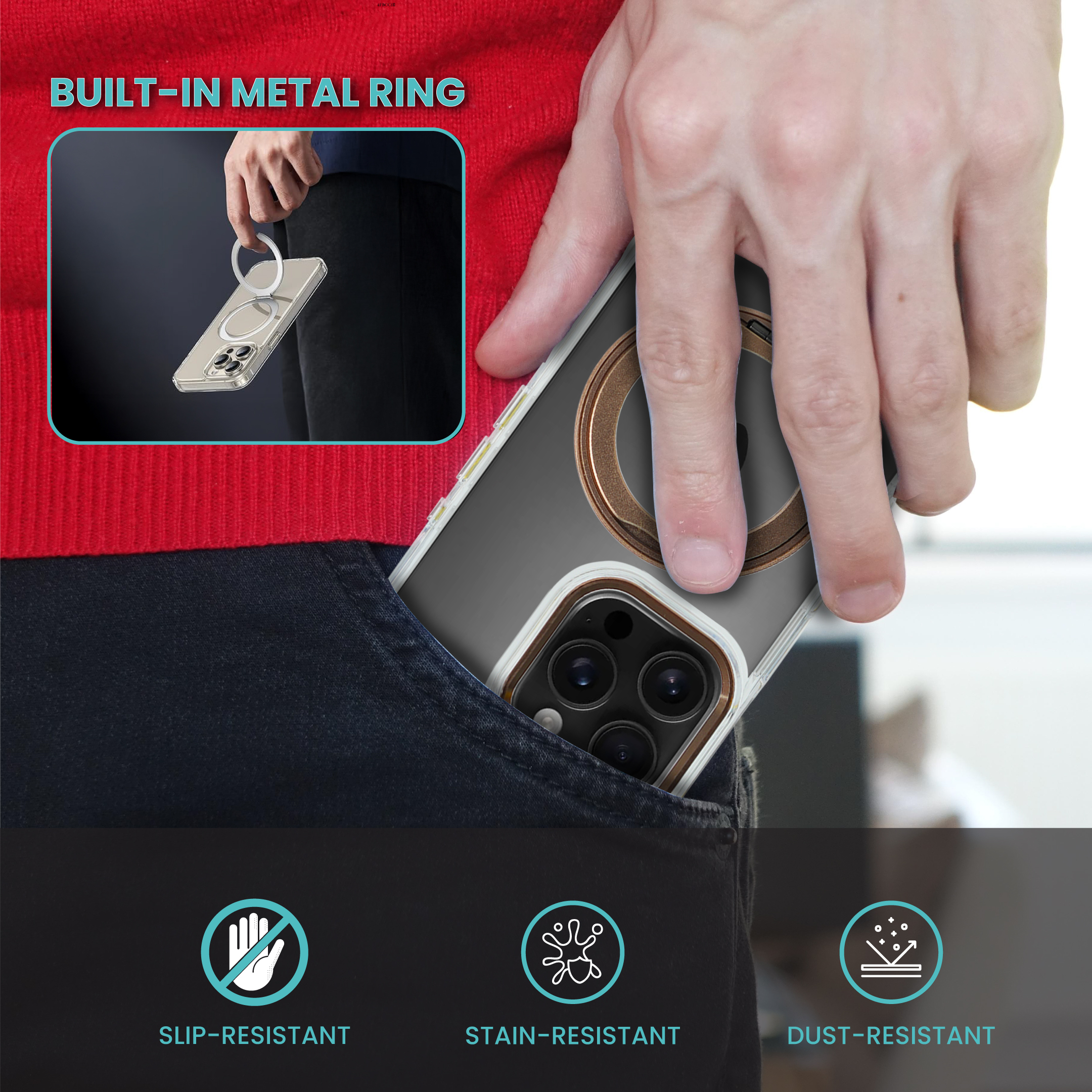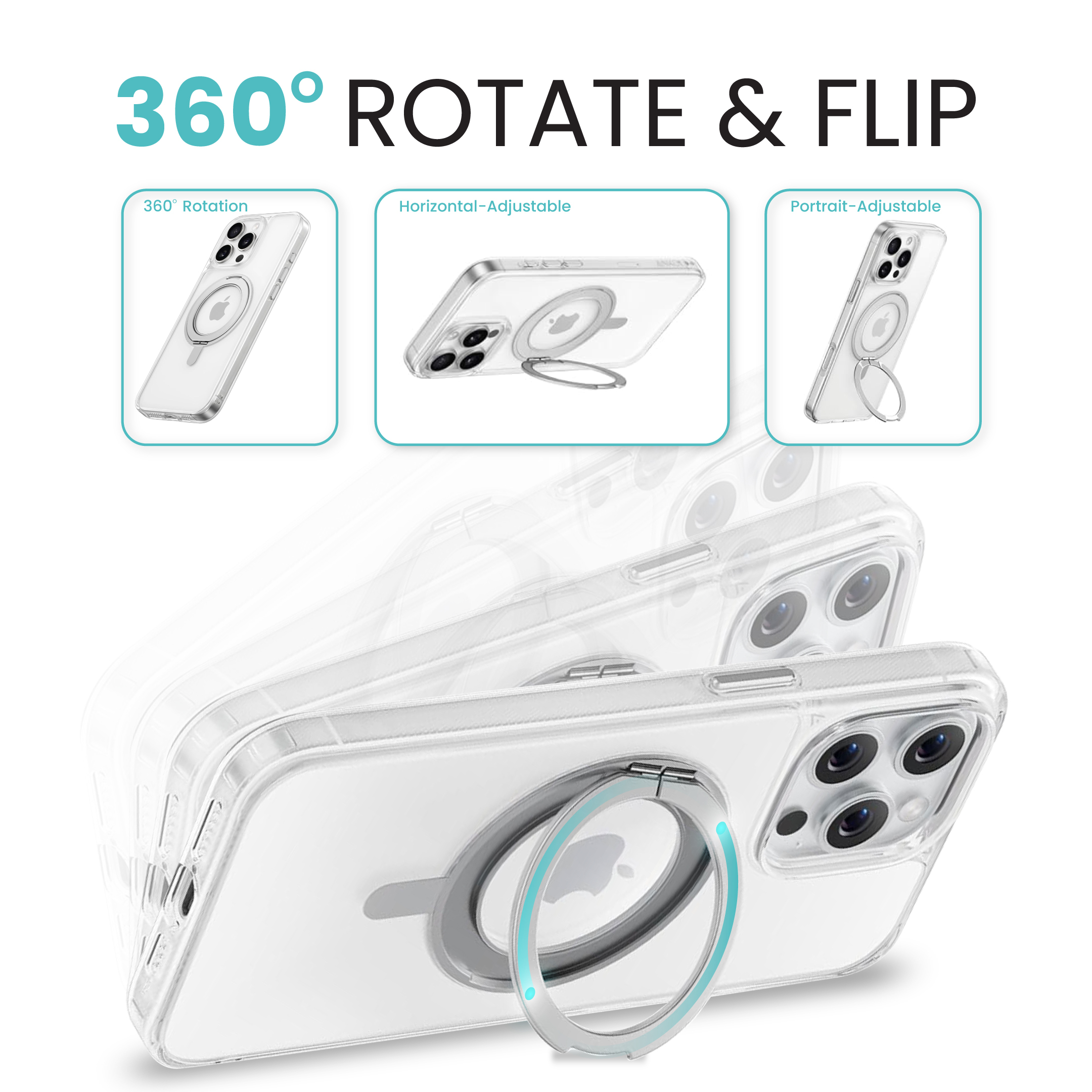 Introducing the AZTECH SuperSnap Clear Case. This innovative case features a built-in 360-degree rotation ring that doubles as a convenient grip and versatile stand. The transparent design showcases your iPhone’s original aesthetics while providing essential protection. The built-in ring mechanism is seamlessly integrated into the clear case, offering both functionality and style. The case’s precise cutouts ensure full access to all ports, buttons, and the camera system, while maintaining a slim profile. Perfect for those who want to keep their iPhone secure while enjoying hands-free viewing at various angles. The rotation ring’s smooth movement allows for optimal positioning whether you’re video calling, watching content, or taking photos. This practical yet stylish case combines everyday utility with reliable protection for your premium device.