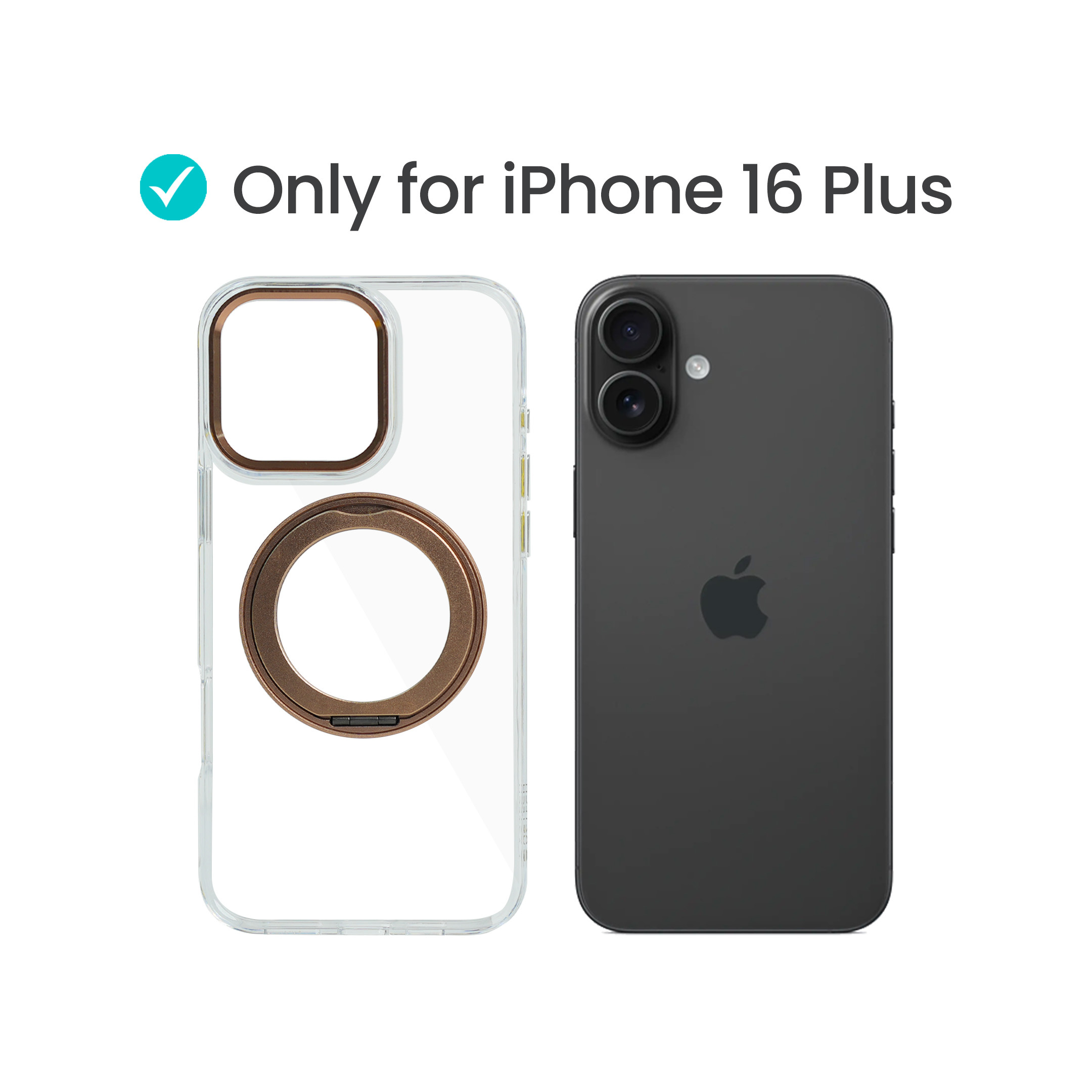 Super Snap Clear Case for iPhone 16 Plus with Built-in 360° Rotation Gold Metal Ring and Support Magnetic Wireless Charging