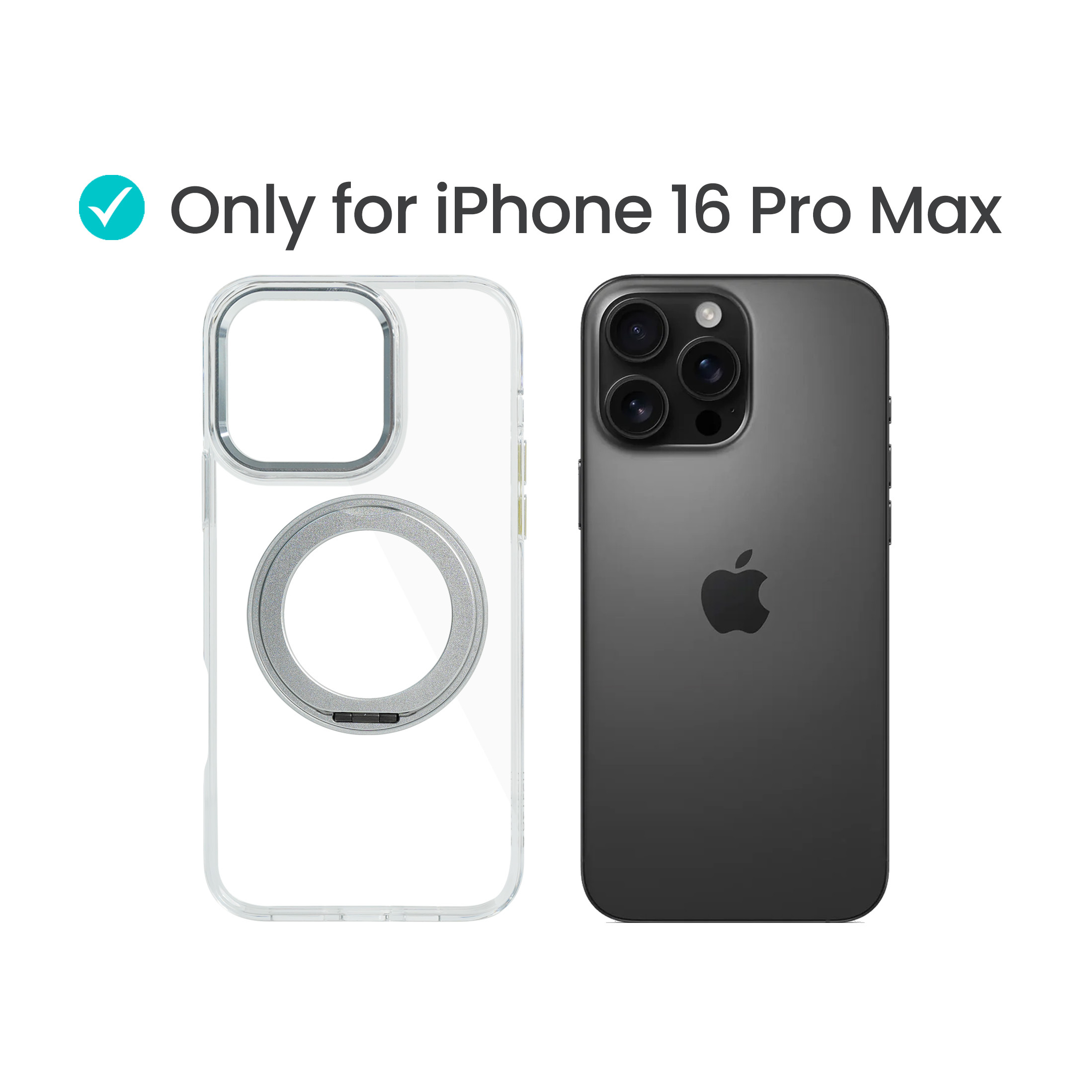 Super Snap Clear Case for iPhone 16 Pro Max with Built-in 360° Rotation Silver Metal Ring and Support Magnetic Wireless Charging
