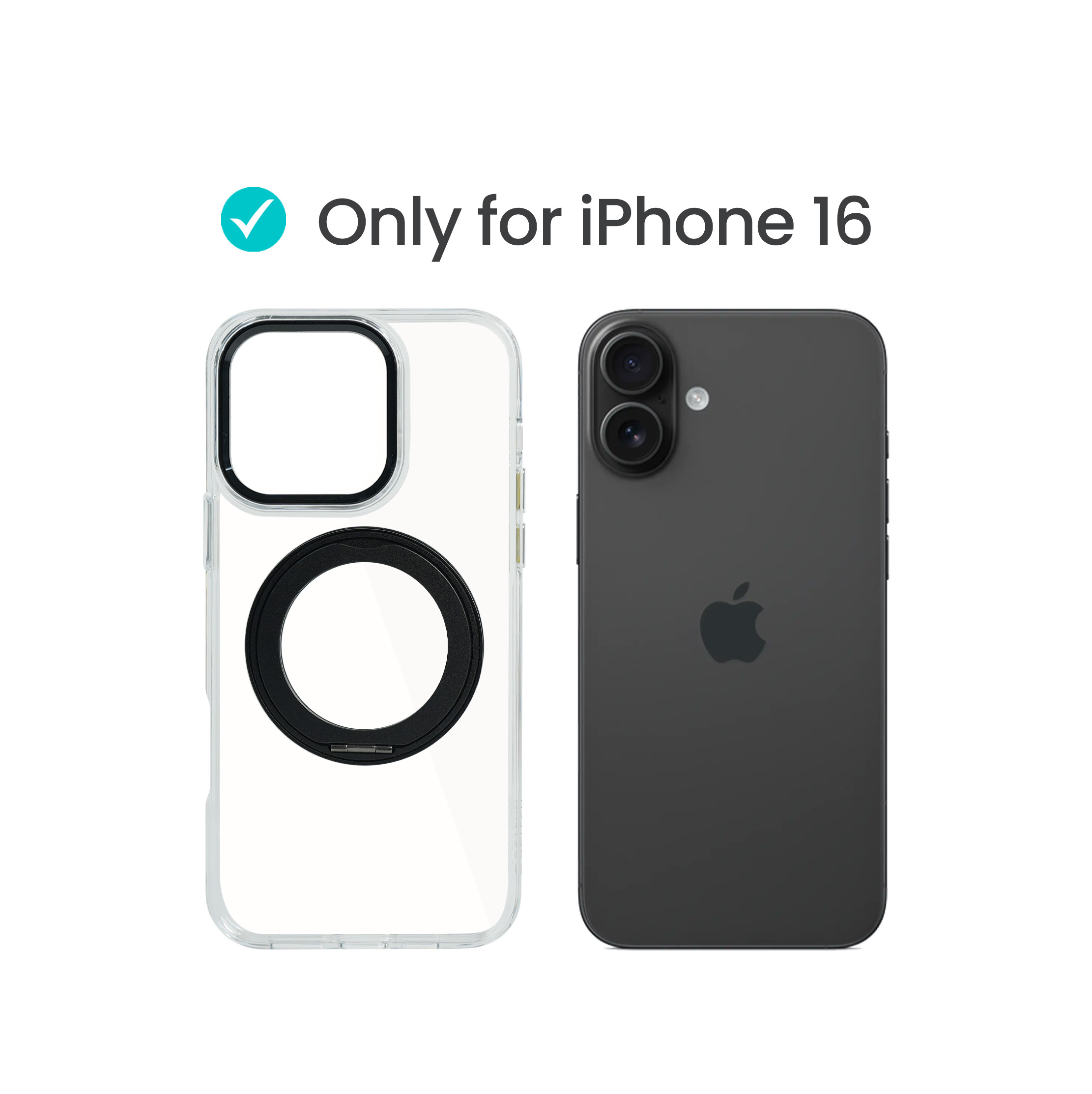 Super Snap Clear Case for iPhone 16 with Built-in 360° Rotation Black Metal Ring and Support Magnetic Wireless Charging